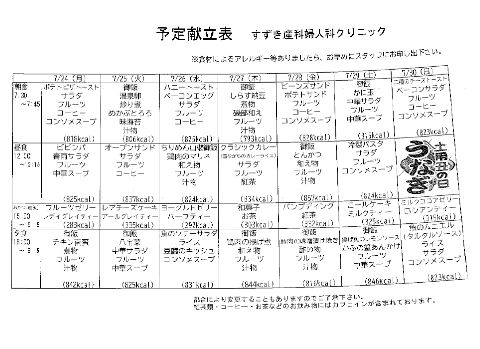献立表の予定をアップします【7月24日〜7月30日】