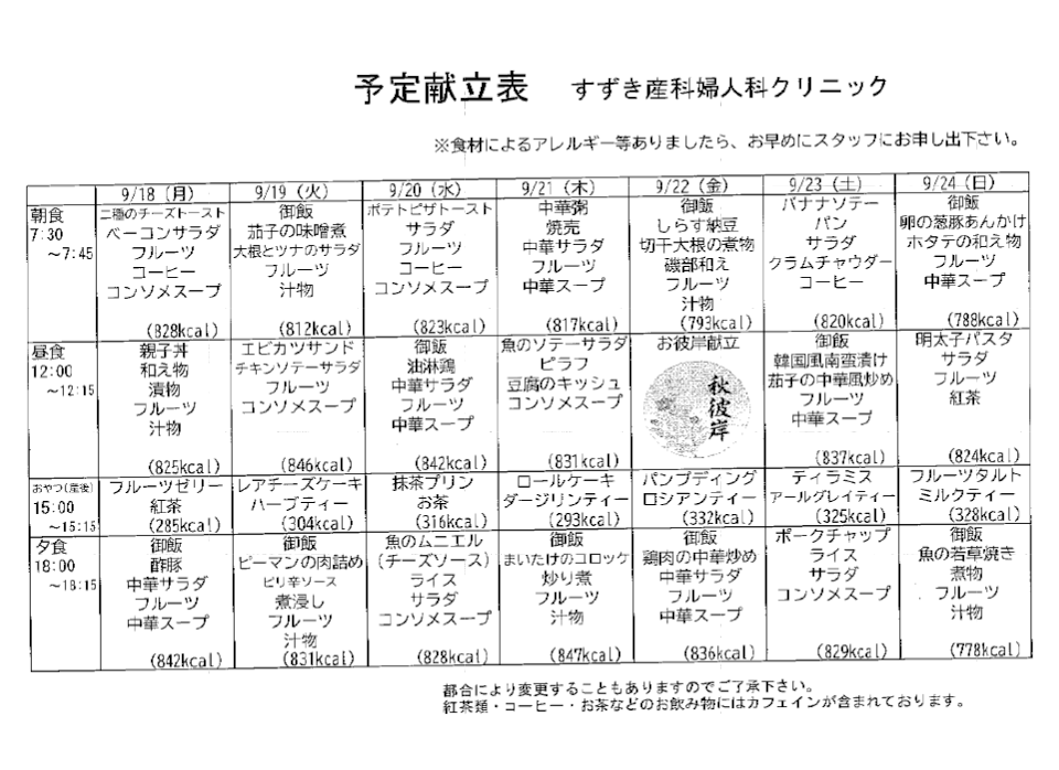 献立表の予定をアップします【9月18日〜9月24日】