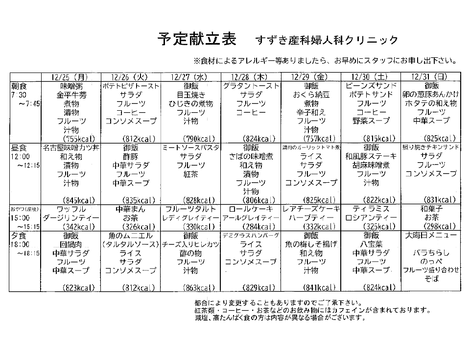 献立表の予定をアップします【12月25日〜12月31日】