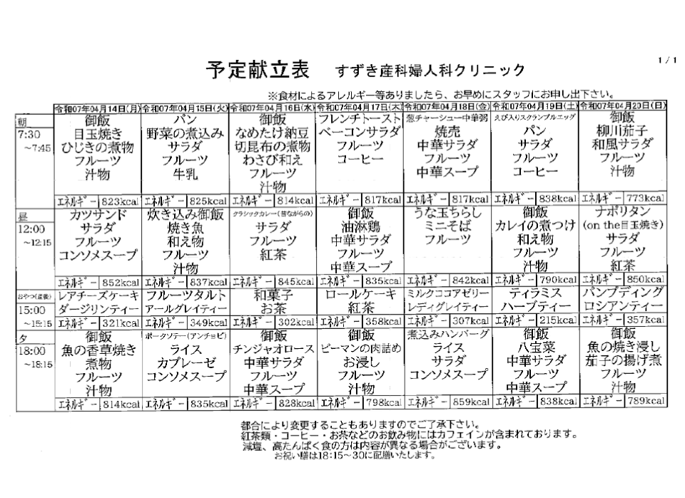 • 献立表の予定をアップします【4月14日〜4月20日】